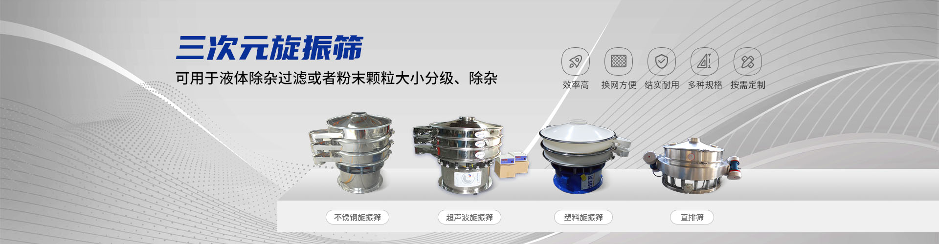 公司的主要產(chǎn)品有:三次元旋振篩、直線振動篩、圓形搖擺篩、方形搖擺篩、脫水篩、超聲波振動篩、塑料振動篩、直排篩、高頻篩、450過濾篩、實驗篩、斗式提升機(jī)、皮帶輸送機(jī)、過濾器、振動電機(jī)等,